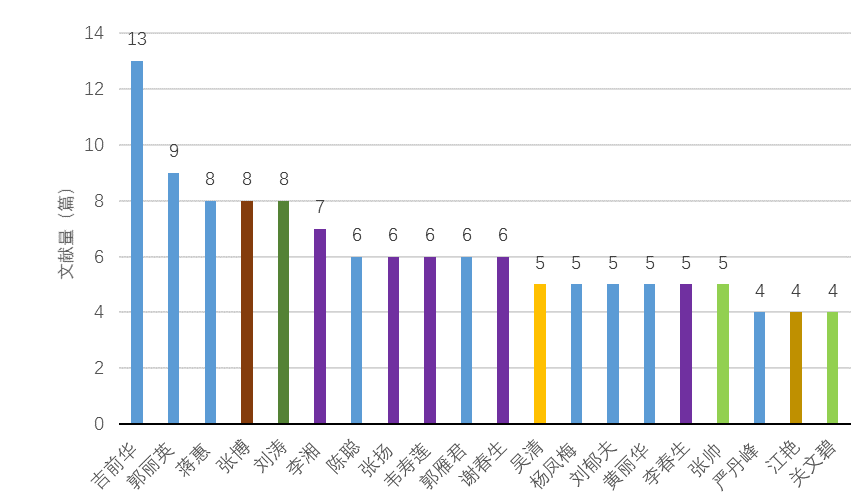 发文量排名前20的作者来自8个学院,具体分布为:生命科学学院(9人)、环境与化学工程学院(5人)、食品与制药工程学院(2人),以及计算机科学与软件学院、经济社会与历史文化研究院(乡村振兴研究院)、旅游与历史文化学院和机械与汽车工程学院(各1人)。